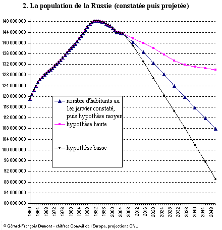 Il importe enfin de noter que la dépopulation de la Russie ne semble pas devoir s'enrayer si l'on considère les projections puisque même celles réalisées selon des hypothèse hautes annoncent un recul à 131 millions en 2040 et, selon les hypothèses basses, à 102 millions.